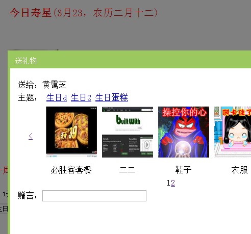 单击其中的一个礼物,就会马上送出去。但是我们现在是要说的还有单击更多的时候,会另外弹出一个新的窗口在当前页面最前面!如下图显示: