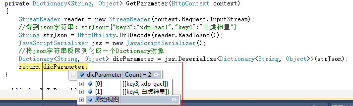 GetParameter方法返回一个dicParameter对象,dicParameter就存放了从$.ajax方法中提交到ashx中的参数,如下图所示: