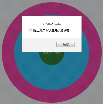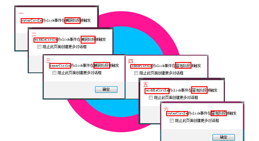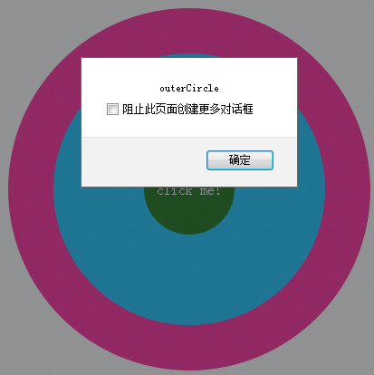 例子:有三个同心圆,给每个圆添加对应的事件处理函数,弹出对应的文字。单击最里面的圆,同时也单击了外面的圆,所以外面圆的click事件也会被触发。