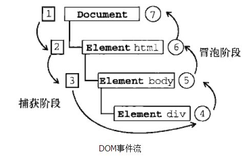 DOM标准规定事件流包括三个阶段:事件捕获阶段、处于目标阶段和事件冒泡阶段。