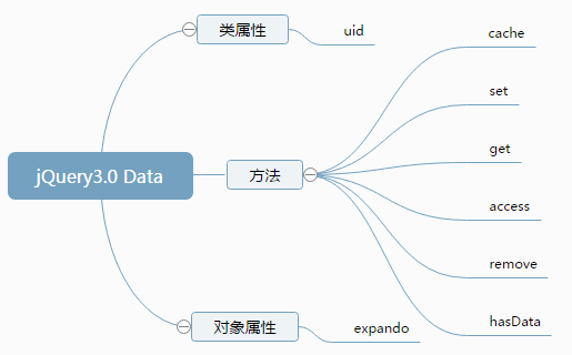 jQuery 3.0 中的 Data 是内部使用的,定义为一个“类”。一共用它创建了两个对象,dataPriv 和 dataUser。Data 有 1 个对象属性(expando)和类属性(uid),有 6 个方法,如下