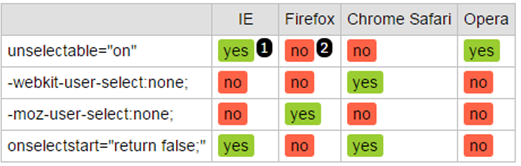 (3)unselectable 的另一个值是 off;除Chrome和Safari外,在其它浏览器中,如果将文本设置为 -ms-user-select:none;,则用户将无法在该文本块中开始选择文本。