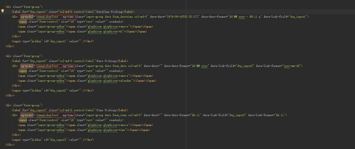 在原先bootstrap-datetimepicker的html片段上添加ng-model='timepickerTest' ng-time