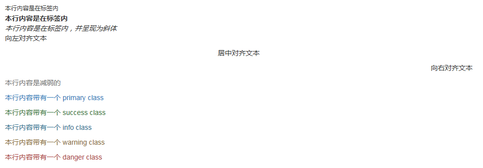 <small>本行内容是在标签内</small><br> <strong>本行内容是在标签内</strong><br> <em>本行内容是在标签内,并呈现为斜体</em><br> <p class="text-left">向左对齐文本</p> <p class="text-center">居中对齐文本</p> <p class="text-right">向右对齐文本</p> <p class="text-muted">本行内容是减弱的</p> <p class="text-primary">本行内容带有一个 primary class</p> <p class="text-success">本行内容带有一个 success class</p> <p class="text-info">本行内容带有一个 info class</p> <p class="text-warning">本行内容带有一个 warning class</p> <p class="text-danger">本行内容带有一个 danger class</p>