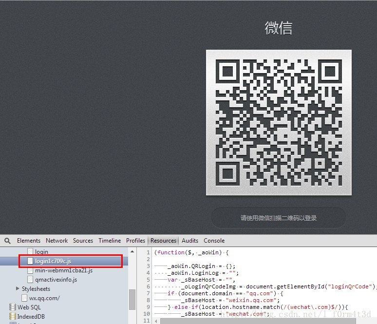 在客户端网页中会不断向服务器发送https连接,并且这里传输很少的数据之后就断开连接了,下面看下微信网页中这个login1c709c.js文件: