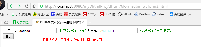 只有全部格式填写正确后再点注册按钮才会有响应。