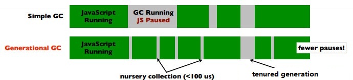 和其他语言一样,javascript的GC策略也无法避免一个问题:GC时,停止响应其他操作,这是为了安全考虑。而Javascript的GC在100ms甚至以上,对一般的应用还好,但对于JS游戏,动画对连贯性要求比较高的应用,就麻烦了。这就是新引擎需要优化的点:避免GC造成的长时间停止响应。