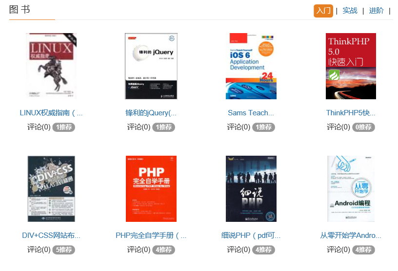 由代码可知,该选项卡一共有三个选项,分为入门、实战、进阶,点击不同的选项卡,则会列出该类型的图书。