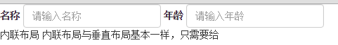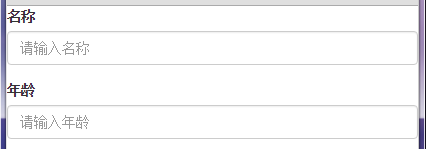 <form role="form"> <div class="form-group"> <label for="name">名称</label> <input type="text" class="form-control" id="name" placeholder="请输入名称"> </div> <div class="form-group"> <label for="name">年龄</label> <input type="text" class="form-control" id="name" placeholder="请输入年龄"> </div> </form>
