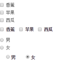 <form role="form"> <!-- 复选 --> <div class="checkbox"> <label><input type="checkbox" value="">香蕉</label> </div> <div class="checkbox"> <label><input type="checkbox" value="">苹果</label> </div> <div class="checkbox"> <label><input type="checkbox" value="">西瓜</label> </div> <div class="checkbox-inline"> <label><input type="checkbox" value="">香蕉</label> </div> <div class="checkbox-inline"> <label><input type="checkbox" value="">苹果</label> </div> <div class="checkbox-inline"> <label><input type="checkbox" value="">西瓜</label> </div> <!-- 单选 --> <div class="radio"> <label> <input type="radio" name="optionsRadios" value="option1" checked> 男 </label> </div> <div class="radio"> <label> <input type="radio" name="optionsRadios" value="option2" checked> 女 </label> </div> <div class="checkbox-inline"> <label> <input type="radio" name="optionsRadios" value="option1" checked> 男 </label> </div> <div class="checkbox-inline"> <label> <input type="radio" name="optionsRadios" value="option2" checked> 女 </label> </div> </form>