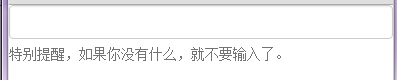 <form role="form"> <div class="form-group"> <input class="form-control" type="text" > <span class="help-block"> 特别提醒,如果你没有什么,就不要输入了。 </span> </div> </form>
