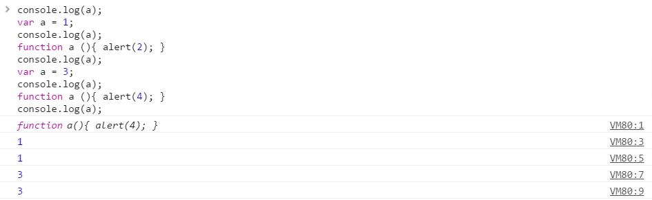 读到第四行时 a = function a (){ alert(2);} //所有的函数,在正式运行代码之前,都是整个函数块;变量遇到重名的,只留一个变量,如果变量和函数重名,就只留下函数。