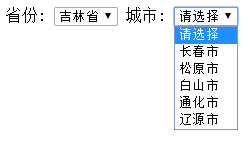 <label>省份:</label> <select id="province"> <option>请选择</option> </select> <label>城市:</label> <select id="city"> <option>请选择</option> </select>