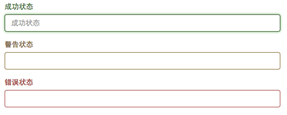 <form role="form"> <div class="form-group has-success"> <label class="control-label" for="inputSuccess1">成功状态</label> <input type="text" class="form-control" id="inputSuccess1" placeholder="成功状态" > </div> <div class="form-group has-warning"> <label class="control-label" for="inputWarning1">警告状态</label> <input type="text" class="form-control" id="inputWarning1" placeholder="警告状态"> </div> <div class="form-group has-error"> <label class="control-label" for="inputError1">错误状态</label> <input type="text" class="form-control" id="inputError1" placeholder="错误状态"> </div> </form>