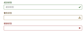 <form role="form"> <div class="form-group has-success has-feedback"> <label class="control-label" for="inputSuccess1">成功状态</label> <input type="text" class="form-control" id="inputSuccess1" placeholder="成功状态" > <span class="glyphicon glyphicon-ok form-control-feedback"></span> </div> <div class="form-group has-warning has-feedback"> <label class="control-label" for="inputWarning1">警告状态</label> <input type="text" class="form-control" id="inputWarning1" placeholder="警告状态"> <span class="glyphicon glyphicon-warning-sign form-control-feedback"></span> </div> <div class="form-group has-error has-feedback"> <label class="control-label" for="inputError1">错误状态</label> <input type="text" class="form-control" id="inputError1" placeholder="错误状态"> <span class="glyphicon glyphicon-remove form-control-feedback"></span> </div> </form>