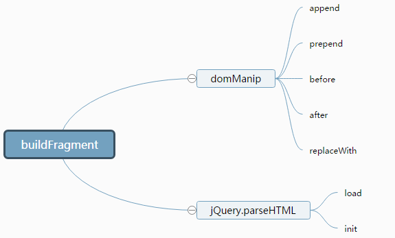 jQuery3.0 中 buildFragment 只在 domManip 和 jQuery.parseHTML 中使用,domManip 则被 DOM 操作如 append、prepend、before、after 等方法的所依赖。