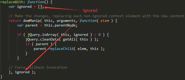 1. 最后两个参数 selection 和 ignored 只在 replaceWith 方法里使用。需要了解的是 replaceWith 只做节点替换,不会替换先前元素的所有数据(Data),比如绑定事件,$.data 都不会被新元素拥有。