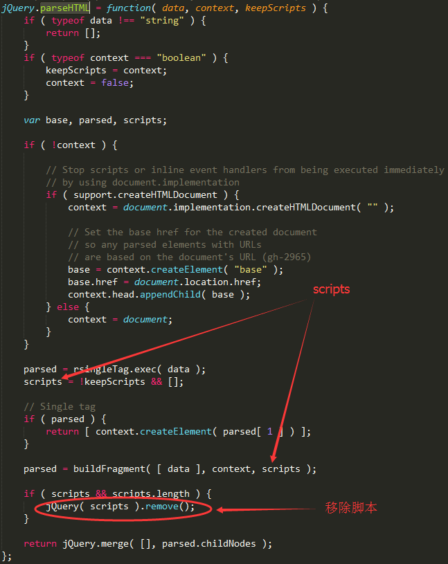 2. scripts 参数只在 jQuery.parseHTML 方法里使用(domManip里传false),当 jQuery.parseHTML 的第三个参数 keepScripts 为 false 时将删除节点里所有的 script tag