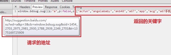 在chrome的调试窗口下看看百度搜索发出的请求。当输入关键字“a”,请求如图:
