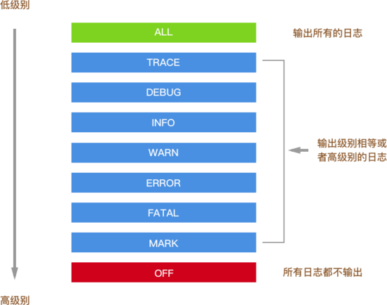 ALL OFF 这两个等级并不会直接在业务代码中使用。剩下的七个即分别对应 Logger 实例的七个方法, .trace .debug .info ... 。也就是说,你在调用这些方法的时候,就相当于为这些日志定了级。因此,之前的 [2016-08-21 00:01:24.852] [DEBUG] [default] - Time: 2016-08-20T16:01:24.852Z 中的 DEBUG 既是这条日志的级别。