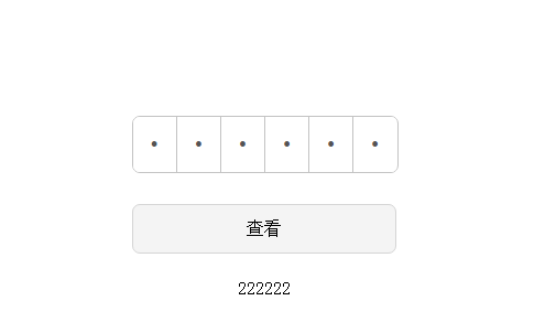<div class="wrap"> <div class="inputBoxContainer" id="inputBoxContainer"> <input type="text" class="realInput"/> <div class="bogusInput"> <input type="password" maxlength="6" disabled/> <input type="password" maxlength="6" disabled/> <input type="password" maxlength="6" disabled/> <input type="password" maxlength="6" disabled/> <input type="password" maxlength="6" disabled/> <input type="password" maxlength="6" disabled/> </div> </div> <button id="confirmButton" class="confirmButton">查看</button> <p class="showValue" id="showValue"></p> </div>