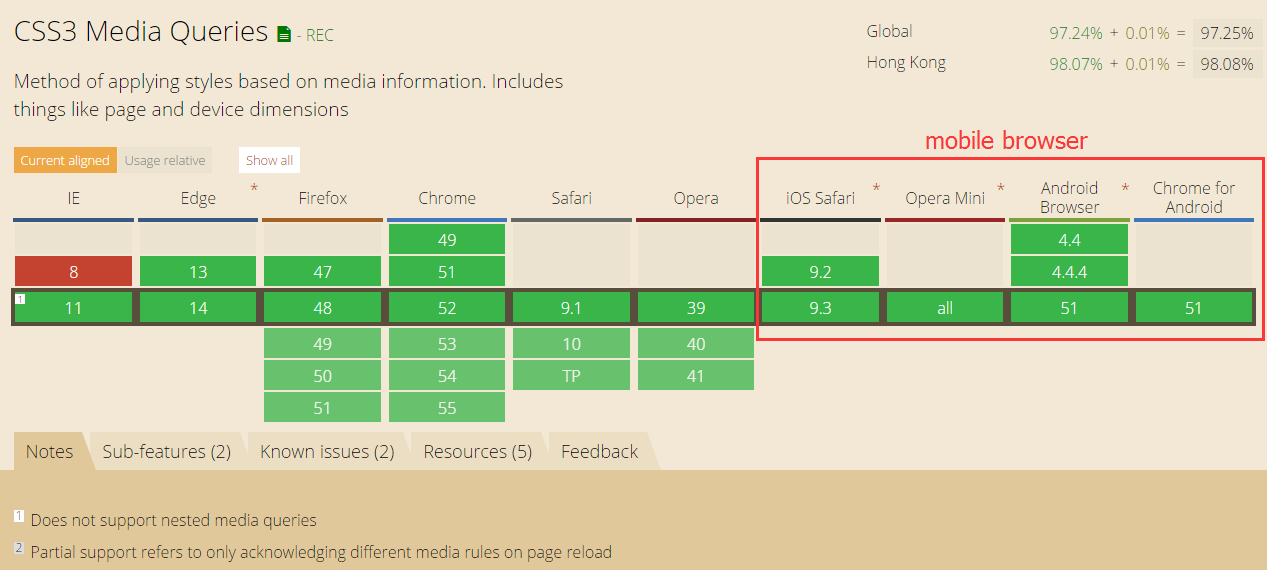 如上上图所示,移动端浏览器都支持CSS3 media。