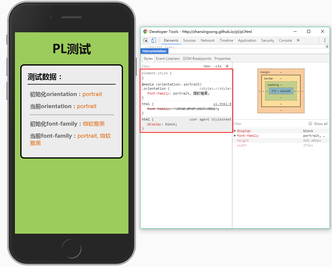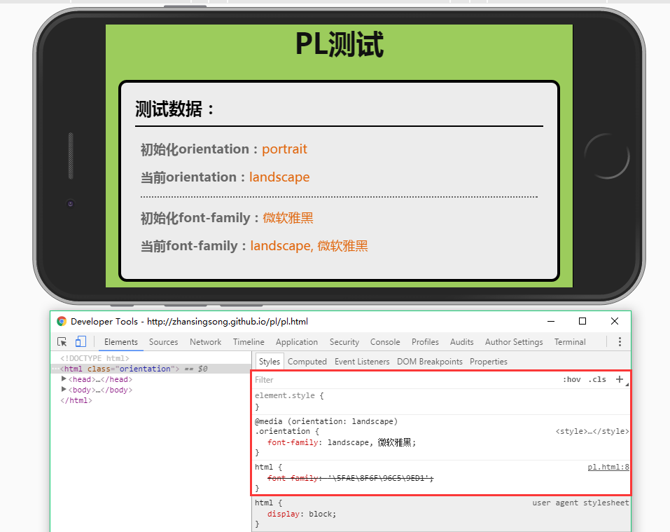 这样我们就可以指定特定标识来标识横竖屏的状态,不过需要将指定的标识放置在其他字体的前面,这样就不会引起hmtl字体的变化。