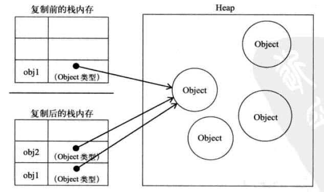 2.引用类型变量的复制:复制的是存储在栈中的指针,将指针复制到栈中为新变量分配的空间中,而这个指针副本和原指针指向存储在堆中的同一个对象;