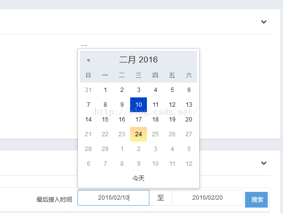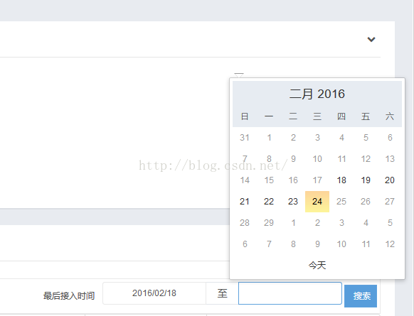 <span style="font-size:14px;"><div class="col-md-6 cy-text-right-md"> <div class="form-inline"> <div class="form-group cy-mar-ver-s"> <span class="cy-pad-hor-s">最后接入时间</span> </div> <div class="input-daterange input-group" id="datepicker"> <input type="text" class="form-control" name="start" id="qBeginTime" /> <span class="input-group-addon">至</span> <input type="text" class="form-control" name="end" id="qEndTime" /> </div> <div class="form-group cy-mar-ver-s"> <button class="btn btn-primary cy-pad-rgt-s" onclick="javascript:doQuery();" type="button">搜索</button> </div> </div> </div></span>