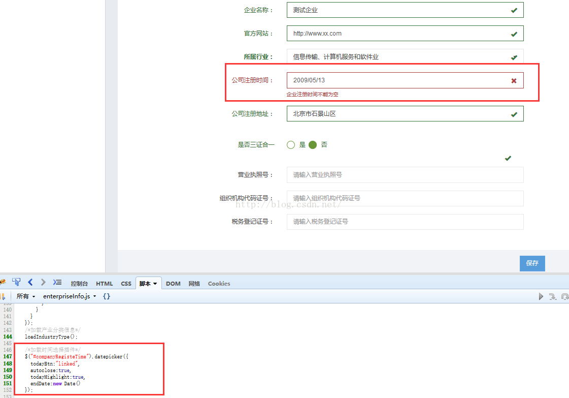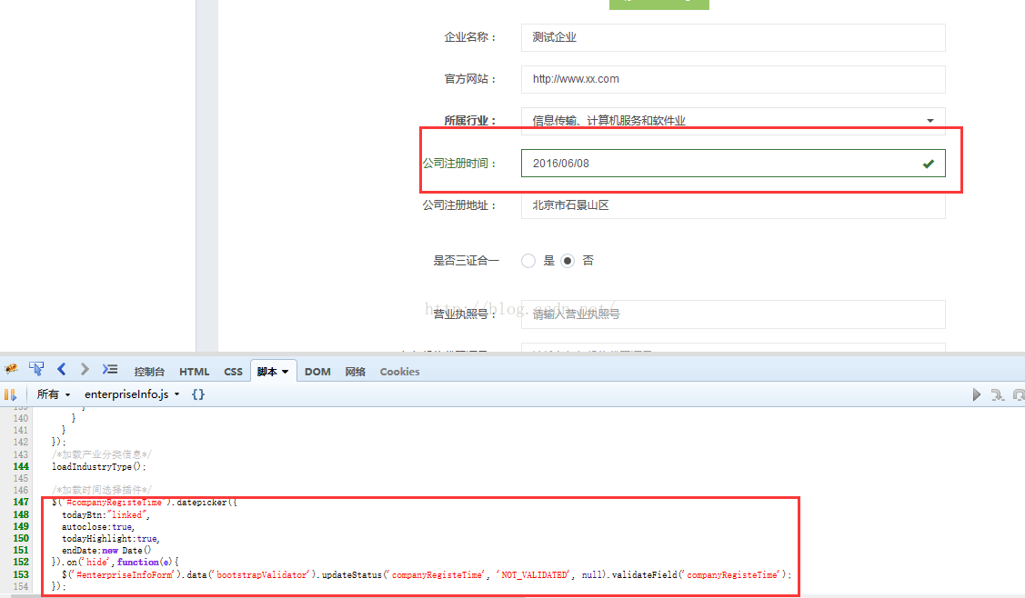 可以看出,当选择完日期后,校验结果并没有达到预期,是因为bootstrapValidator插件默认情况下,不会重复校验一个已经标记为验证通过或验证不通过的字段。so ,当开始触发校验后,没有通过校验,当正确选择日期后,并不会刷新校验结果,就会导致数据无法正常提交,当手动把日期改变后,会发现校验被正确触发了。现在就说解决方法。