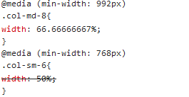 当屏宽小于768px(即小屏)时,列的划分以.col-xs-后面的数字为准。如果没定义.col-xs-,就会变成单列且宽度和row相等。