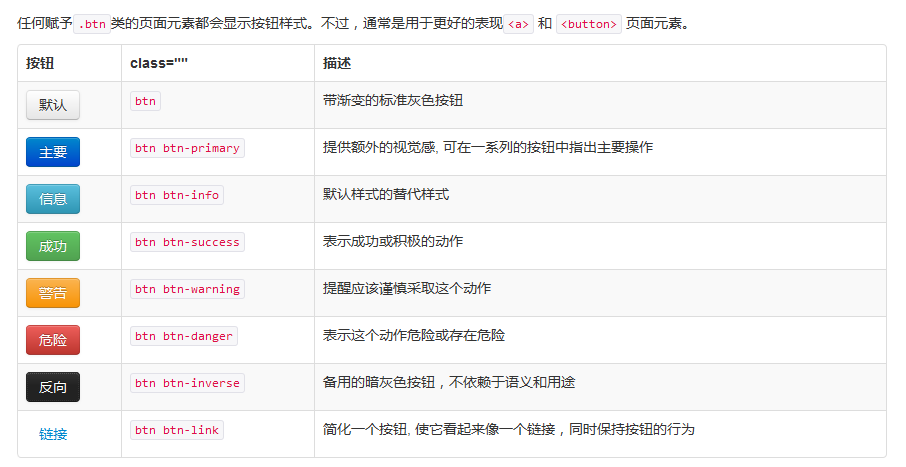 如果在Bootstrap官方网站看过btn按钮或者alert警告框的样例,你会发现,Bootstrap默认为很多组件都提供了5种颜色的样式,这5种颜色分别是:primary(重点蓝)、success(成功绿)、info(信息蓝)、warning(警告橙)、danger(危险红)。定义规则是:组件名称-颜色类型,如btn-primary、alert-info。以按钮(btn为例)