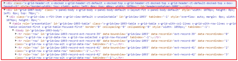 其中grid-body包含了许多tr元素,每一个tr都是代表Grid组件中的一行数据;每个tr内部都包含了许多td,每个td表示一个单元格。