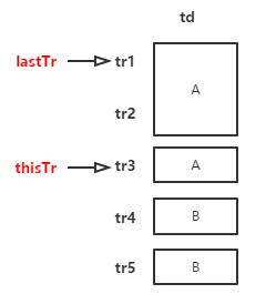 1) tr1与tr2比较,两者值相等:设置tr1的rowspan属性的值+1;设置第tr2的td隐藏。