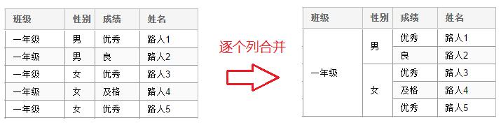 说明:每个列在前面列合并的前提下可分别合并。