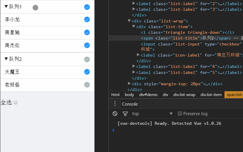 changeAllChecked方法:当主动触发全选框时,如果checked为true,则将全部的子项都放进selected数组里;反之则清空全部selected数组。