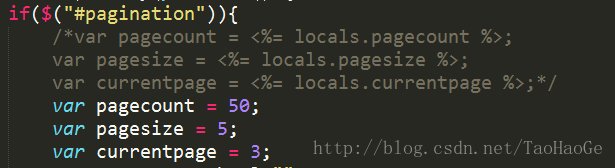 注意:locals.pagecount,locals.pagesize,locals.currentpage分别是数据库数量,分页大小,当前分页,他们是从js中传递过来的,当然,你也可以直接修改它们为固定的数据测试下效果。