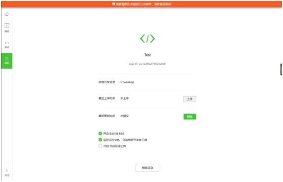 这边需要注意的是这个上传代码需要管理员才能进行上传,当然没有没有AppID是上传不了的啦。由于现在是公测阶段,我们上传的代码也不能真正的让用户看到只有开发者可以看到。
