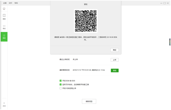 这边需要注意的预览只能是在登录了和当前IDE相同微信号的手机上。其他手机通过微信扫码将不能进行预览。