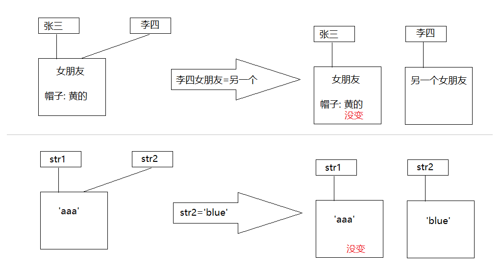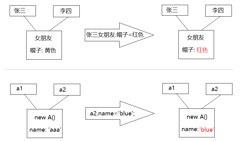 //情况1:换帽子 你.女朋友=梦琪; 你.女朋友.帽子=红色; console.log(梦琪.帽子); //红色 //情况2:换女朋友 你.女朋友=梦琪; 你.女朋友=安易; console.log(梦琪.帽子); //黄色,没变