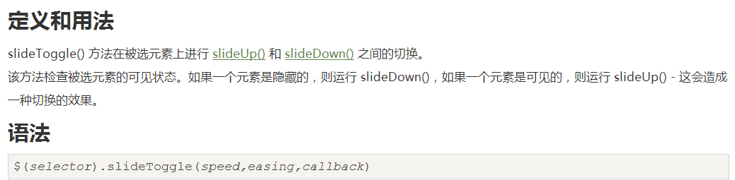 这里首先要引入jQuery库,然后才能调用jquery库里面的方法slideToggle(),方法的具体实现如下: