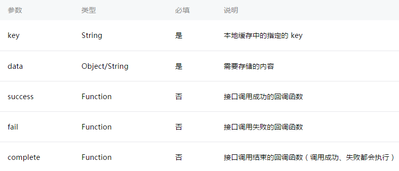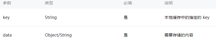 将 data 存储在本地缓存中指定的 key 中,会覆盖掉原来该 key 对应的内容,这是一个同步接口。