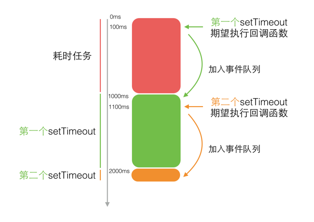 两个 setTimeout 的等待事件由于耗时任务的存在不再是 100ms 了!我们来描述一下事情的经过: