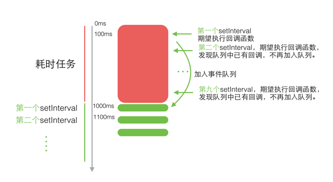 上面这段代码,我们期望每隔 100ms 就打出一条日志。相对于 setTimeout 的区别, setInterval 在准备把回调函数加入到事件队列的时候,会判断队列中是否还有未执行的回调,如果有的话,它就不会再往队列中添加回调函数。 不然,会出现多个回调同时执行的情况。
