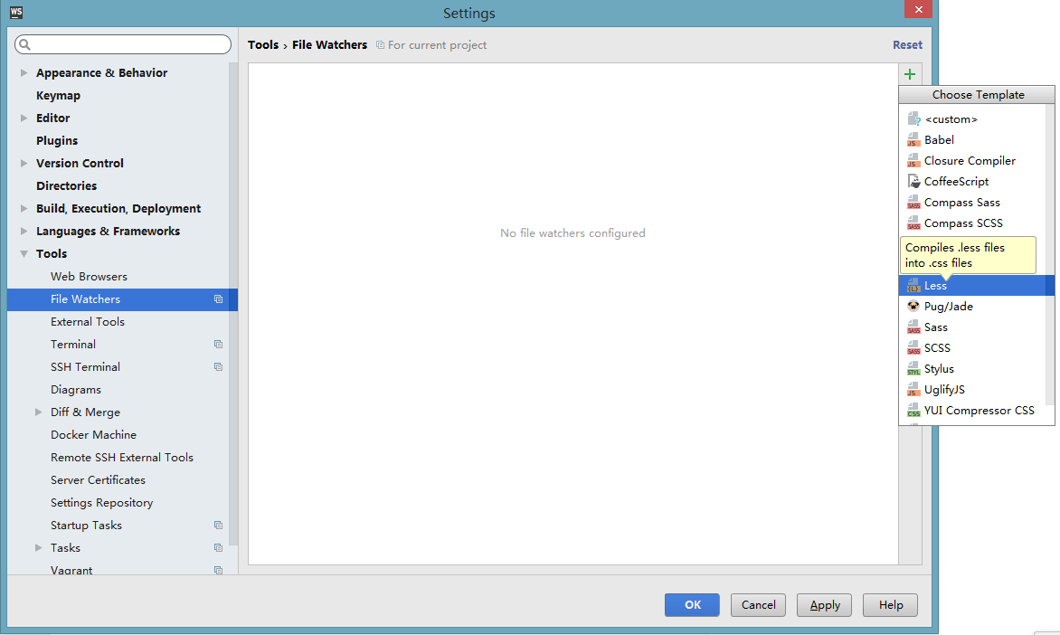 2).展开左边列表最后一项,找到File Watchers。我们可以看到右侧的白色方框,再点击添加图标,选择less。如图所示: