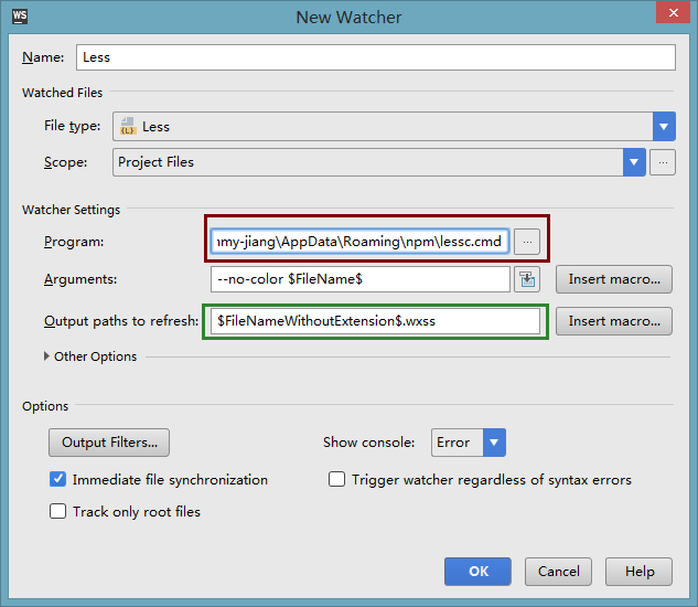 3).在打开的的方框中,我们可以看到一些相关的配置。其他的我们不用管,我们只要关注两个地方:程序的路径和输出路径。 程序路径是我前面安装的 less路径,输出路径这个地方修改一下,将原来默认的.css改成.wxss。如下图: