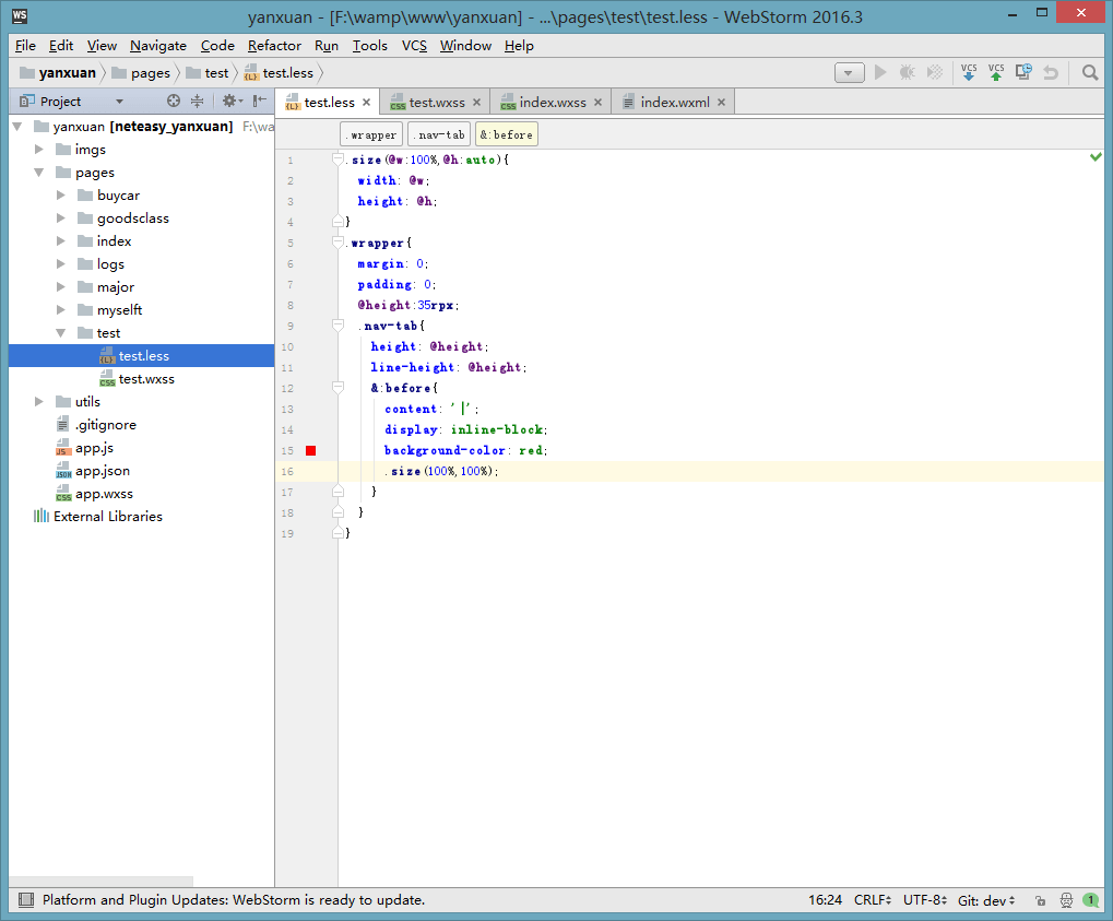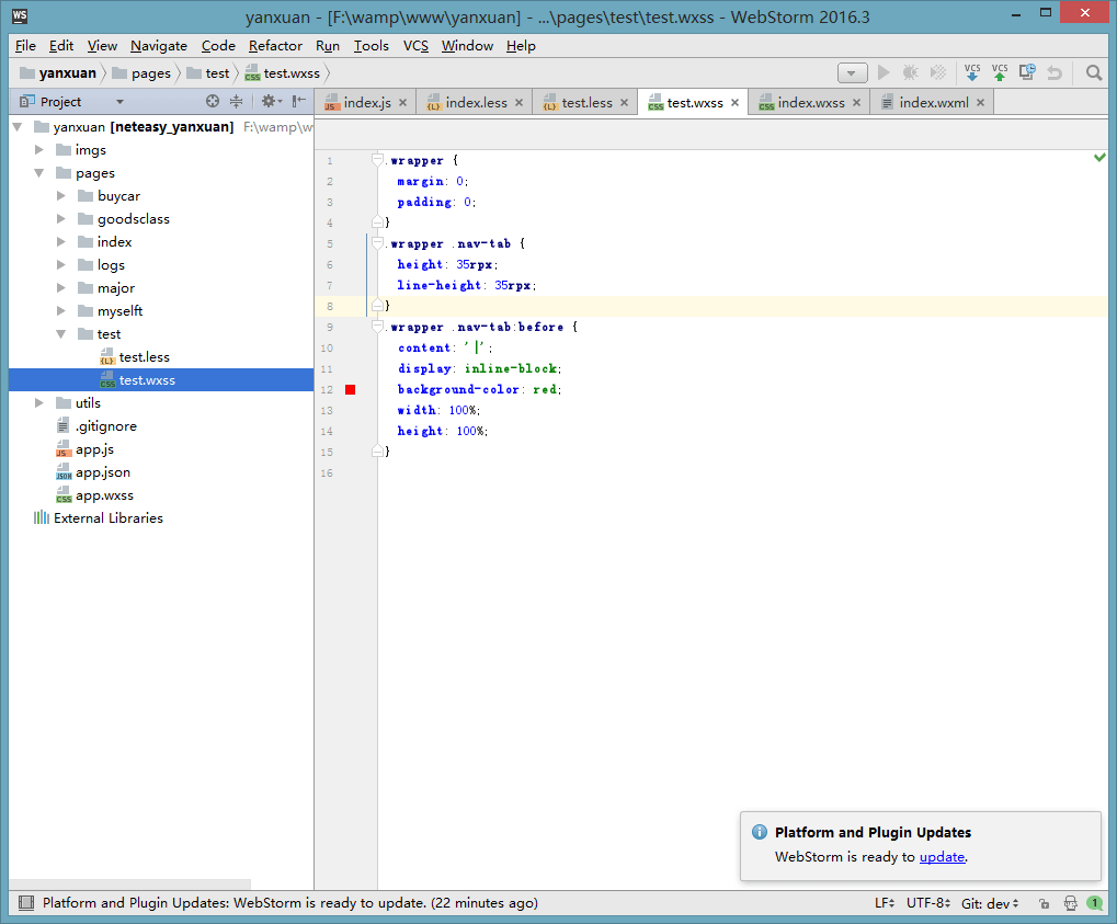 2).编写less文件,然后保存,再打开wxss文件,发现编译成功,那我们大功告成了。