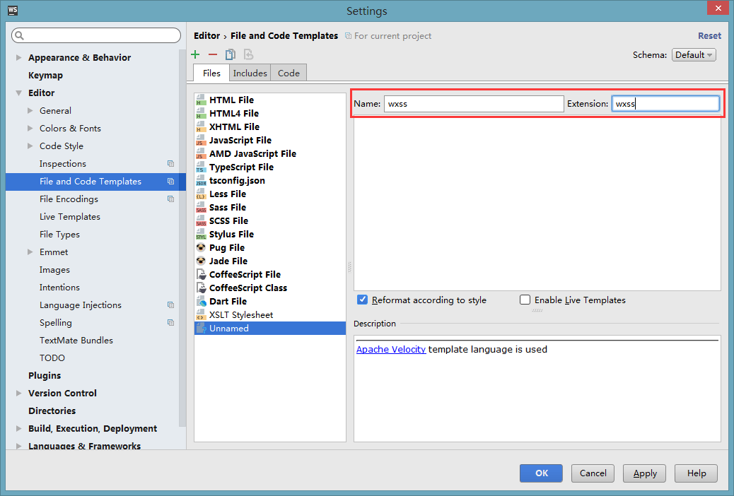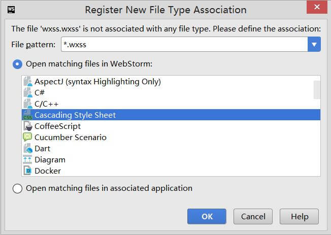 2).点击添加图标,在拓展名输入框输入wxss,点击Apply.