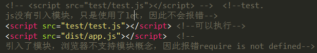 在浏览器中测试,test中因为没引入模块,所以正常执行,app中因为引入了模块,而且是CommonJS规范,但是浏览器不支持这种规范,因此报错