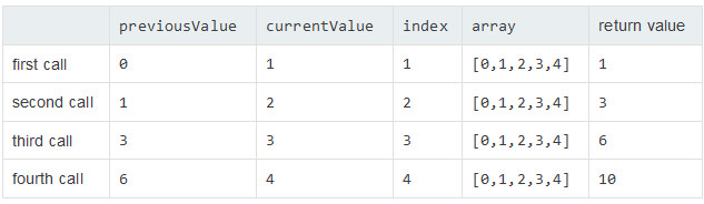 [0, 1, 2, 3, 4].reduce((previousValue, currentValue, index, array) => previousValue + currentValue);